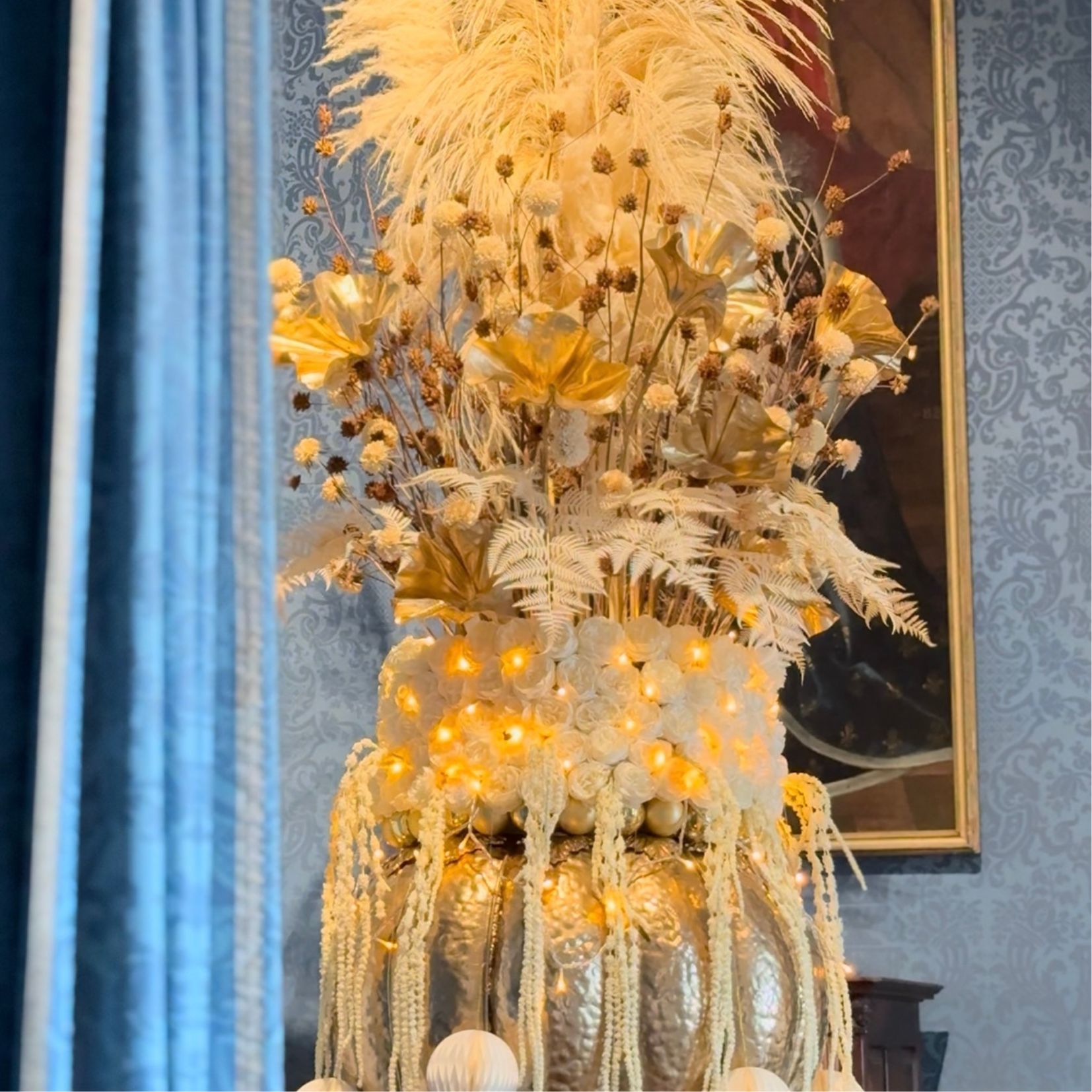Dans cette chambre royale, la majesté rencontre la générosité. Une grande jarre fleurie se dresse au centre, mélangeant bleu nuit, blanc et or dans des harmonies délicates. Chaque détail apporte chaleur, splendeur et sophistication, transformant la pièce en un véritable écrin floral.