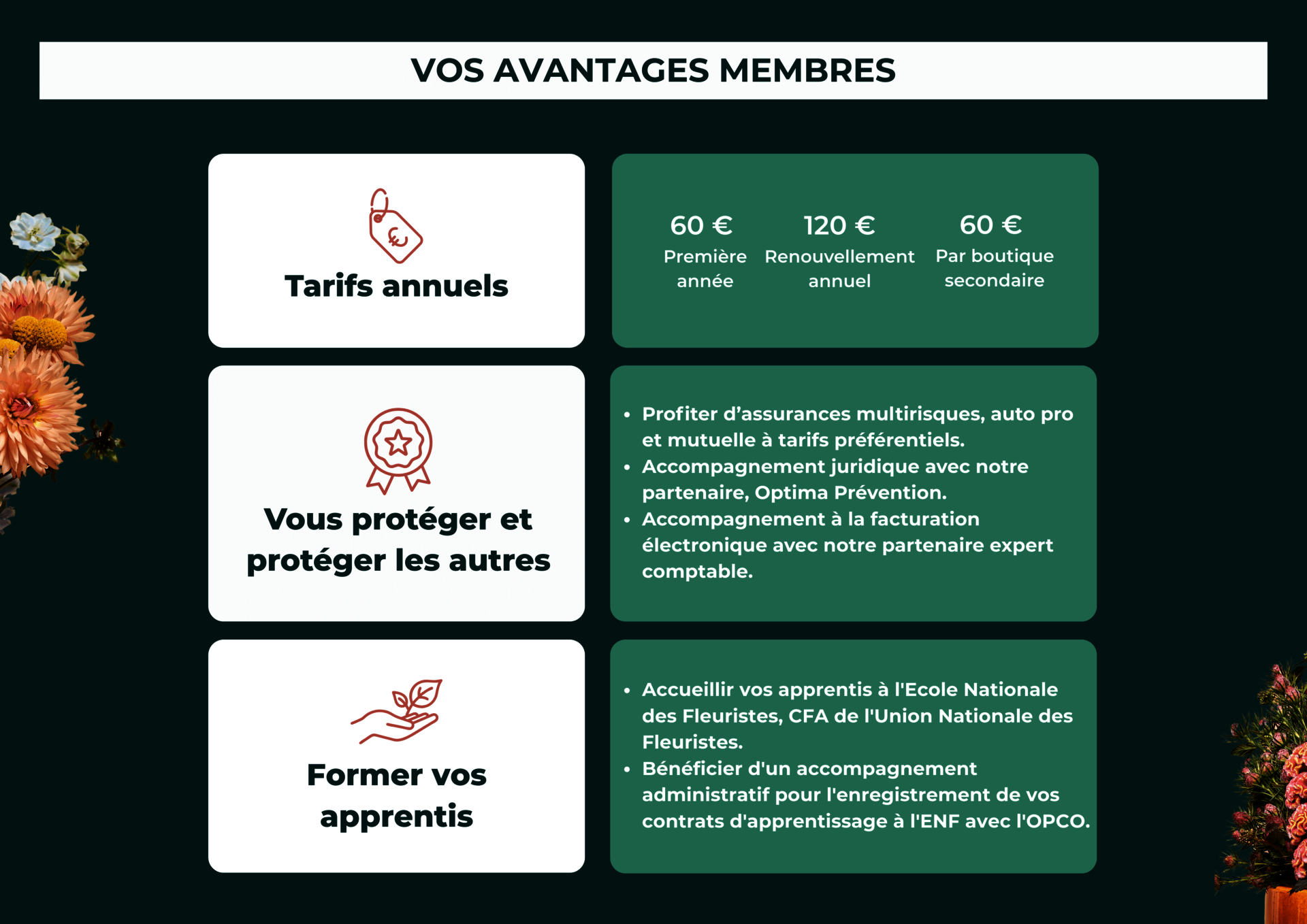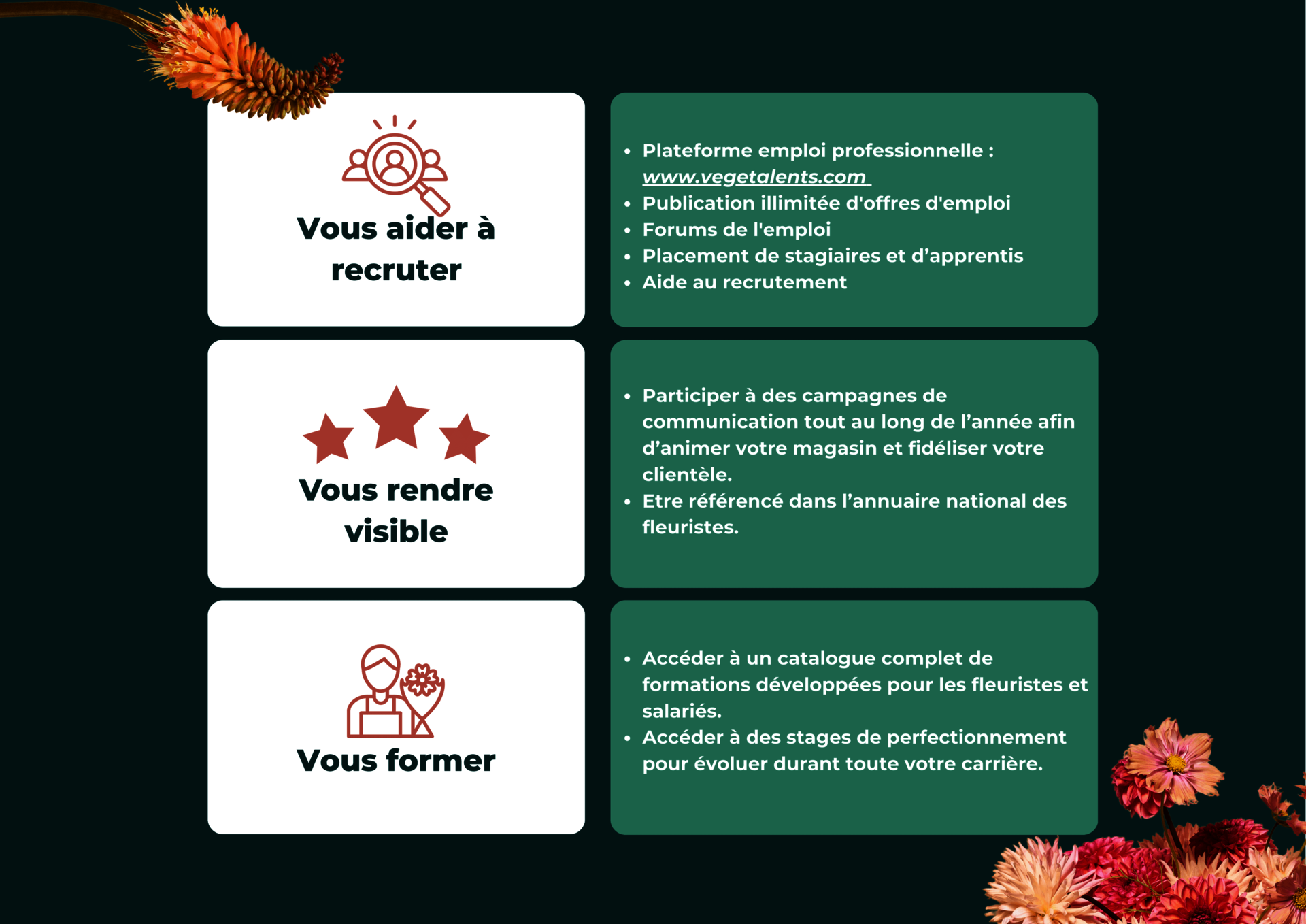 - Accéder à un catalogue complet de formations développées pour les fleuristes et salariés.